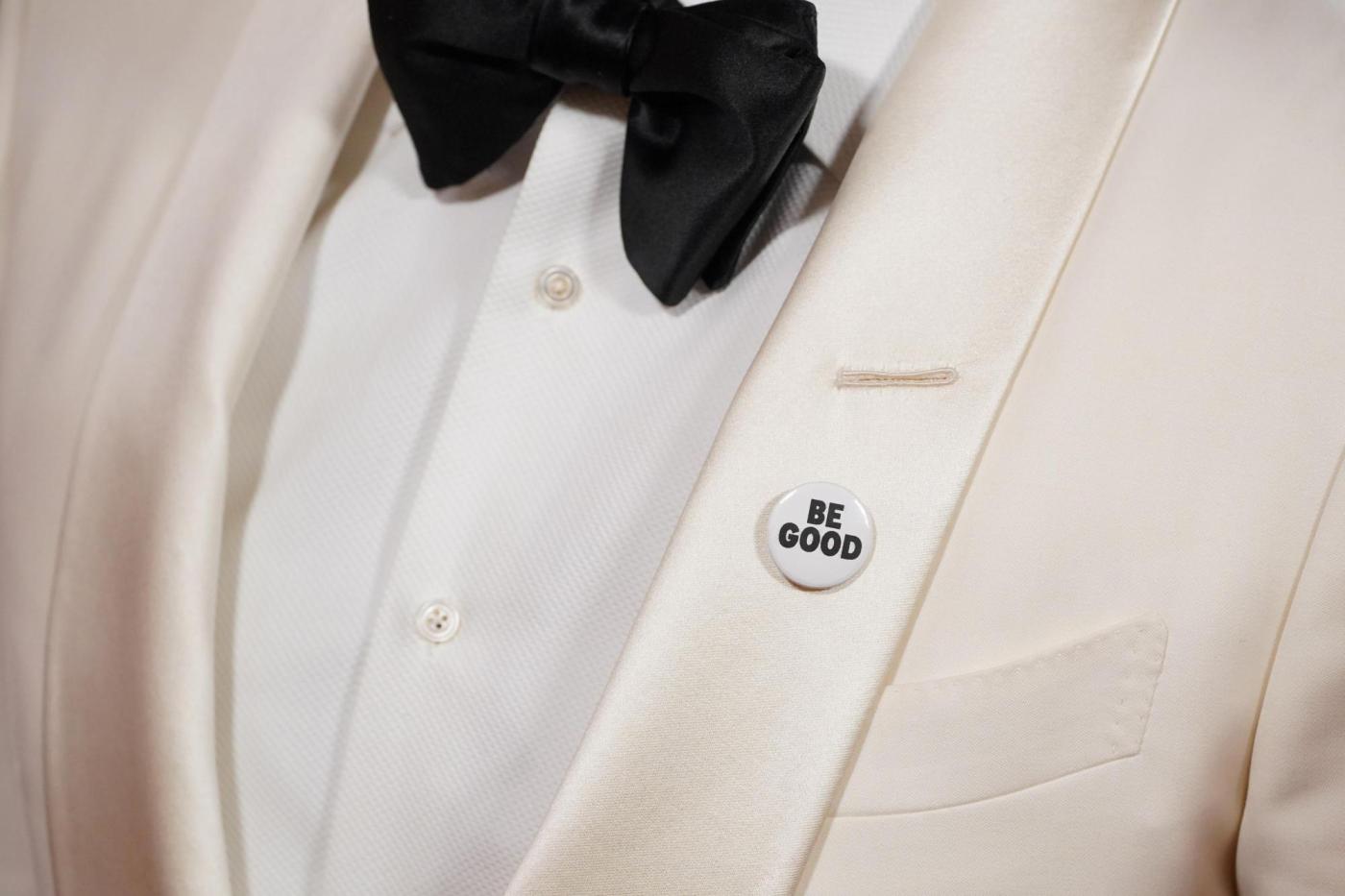 The black-and-white pins displayed slogans like “BE GOOD” and “ICE OUT,” introducing a political angle into the awards show after last year’s relatively apolitical ceremony.