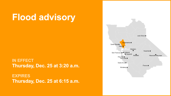 Napa County is included in a flood advisory issued by the National Weather Service on Thursday at 3:20 a.m. The advisory is in effect until 6:15 a.m.